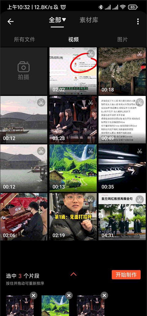 2、然后选择需要拼接的视频,然后单击开始制作。