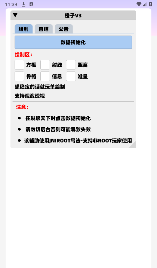 作为专为游戏玩家设计的辅助工具,橙子直装以其精准的定位、高效稳定的性能和丰富的个性化设置赢得了广大玩家的认可和喜爱,旨在帮助玩家在游戏中获得更好的体验和更高的获胜率。橙子直装app界面简单,操作设置非常容易。玩家可以根据自己的需要轻松调整软件参数,从而改善游戏体验。该软件无需root权限即可使用,运行稳定,兼容性强,可应用于不同的游戏版本和设备型号,不仅可以帮助玩家在游戏中取得更好的成绩,还可以增强他们的游戏体验和乐趣!