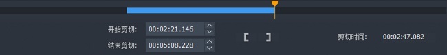 第二步:拖动进度条到你要开始剪切的时间点,也可以点击播放按钮播放视频,再单击设置开始剪切点按钮,然后再拖动进度条到你要结束剪切的时间点,再单击设置结束剪切点按钮,中间蓝色部分就是剪切出来的(也就是保留下来的),你也可以直接在开始和结束剪切编辑框里输入剪切时间段,这样就不用拖动进度条了