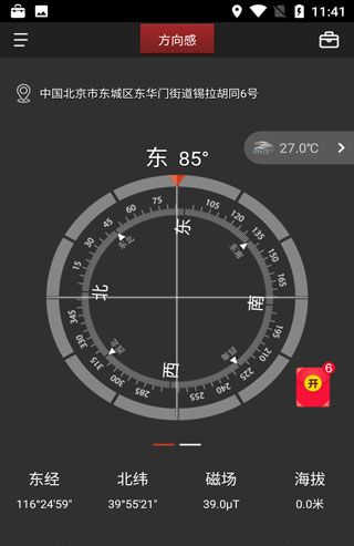 2、点击左下角的“指南针”,现在您可以看到您所在位置的经纬度、磁场、高度、天气。