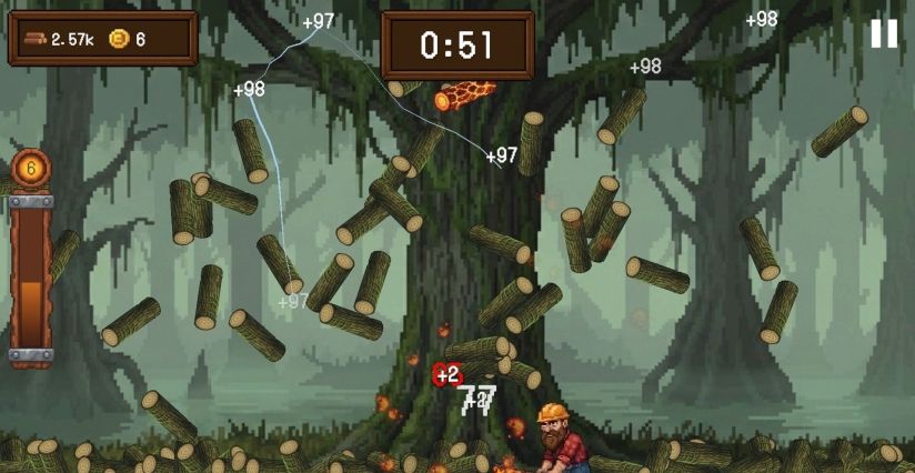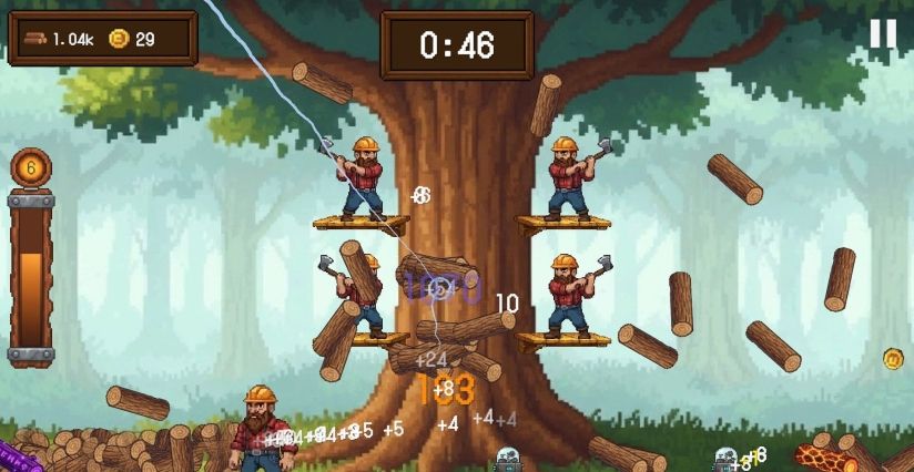 疯狂挥砍一棵巨大的树木,让原木、金币和强化道具倾泻而下。
