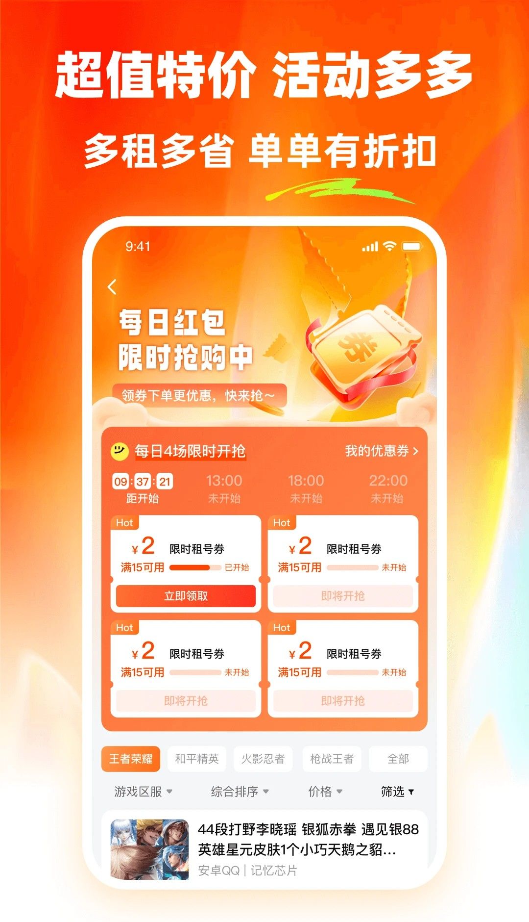 3、丰富的促销活动:定期推出n小时租赁、n小时免费等促销活动,让玩家享受更多福利。