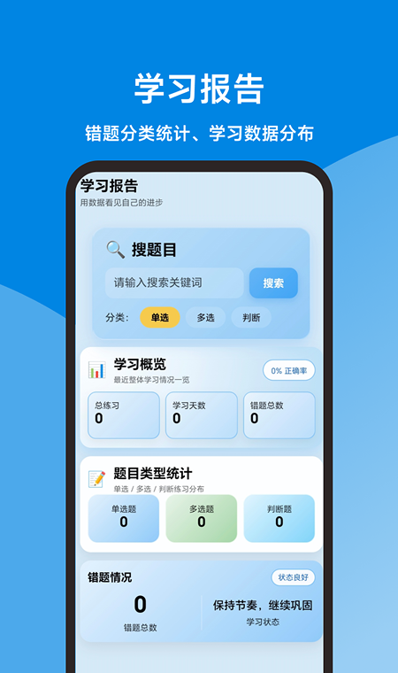 实时展示总练习量、学习天数、错题总数、正确率,清晰掌握备考进度;按题型分类统计练习数据,精准定位薄弱题型;自动归集错题并分析情况,支持关键词、题型快速检索题目,高效复盘重难点。
