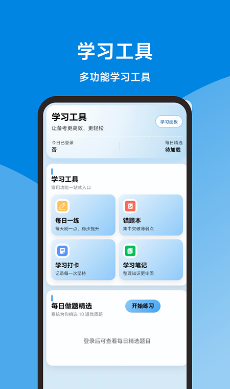 界面简洁易上手,每日一练功能适配通勤、休息等碎片时间,不用挤大块时间也能保持备考状态,轻松养成持续刷题的好习惯。