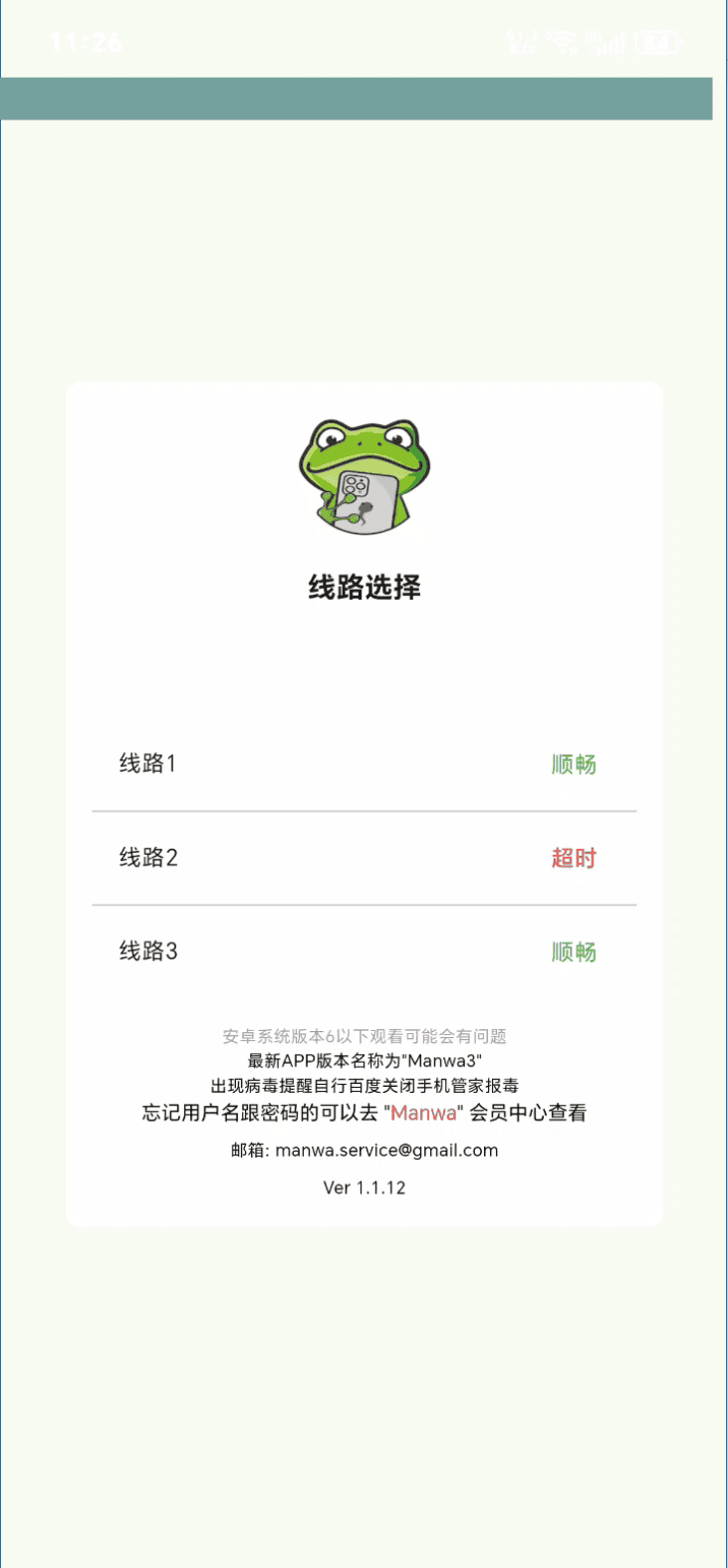 1、打开漫蛙3漫画,在“线路选择”页面,优先挑选状态显示为“顺畅”的线路,比如“线路1”,点击进入应用。