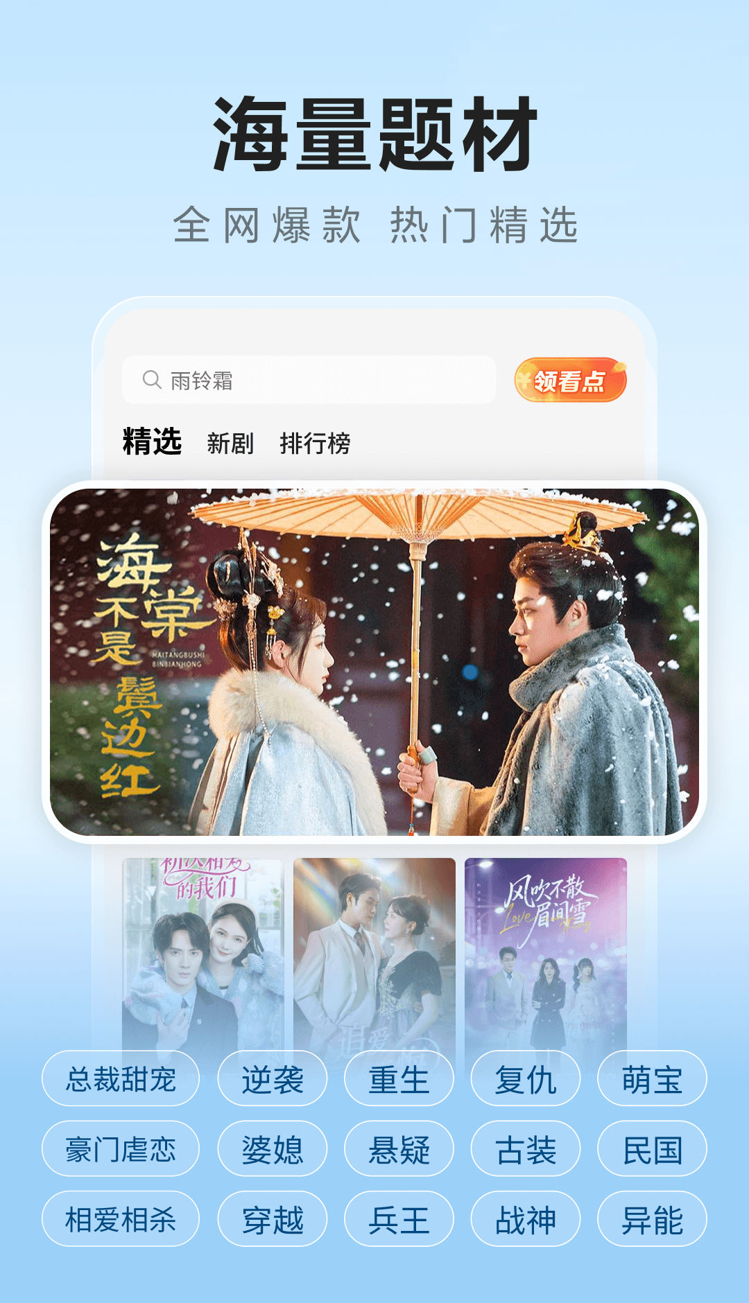 从逆袭爽剧、甜宠恋爱,到悬疑推理、古装民国,各类热门短剧题材全覆盖,满足不同用户的追剧喜好,刷剧不重样。
