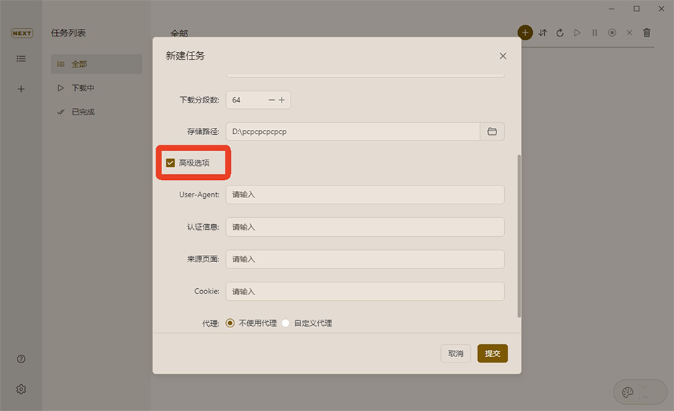 3)勾选【高级选项】可设置User-Agent、认证信息等。