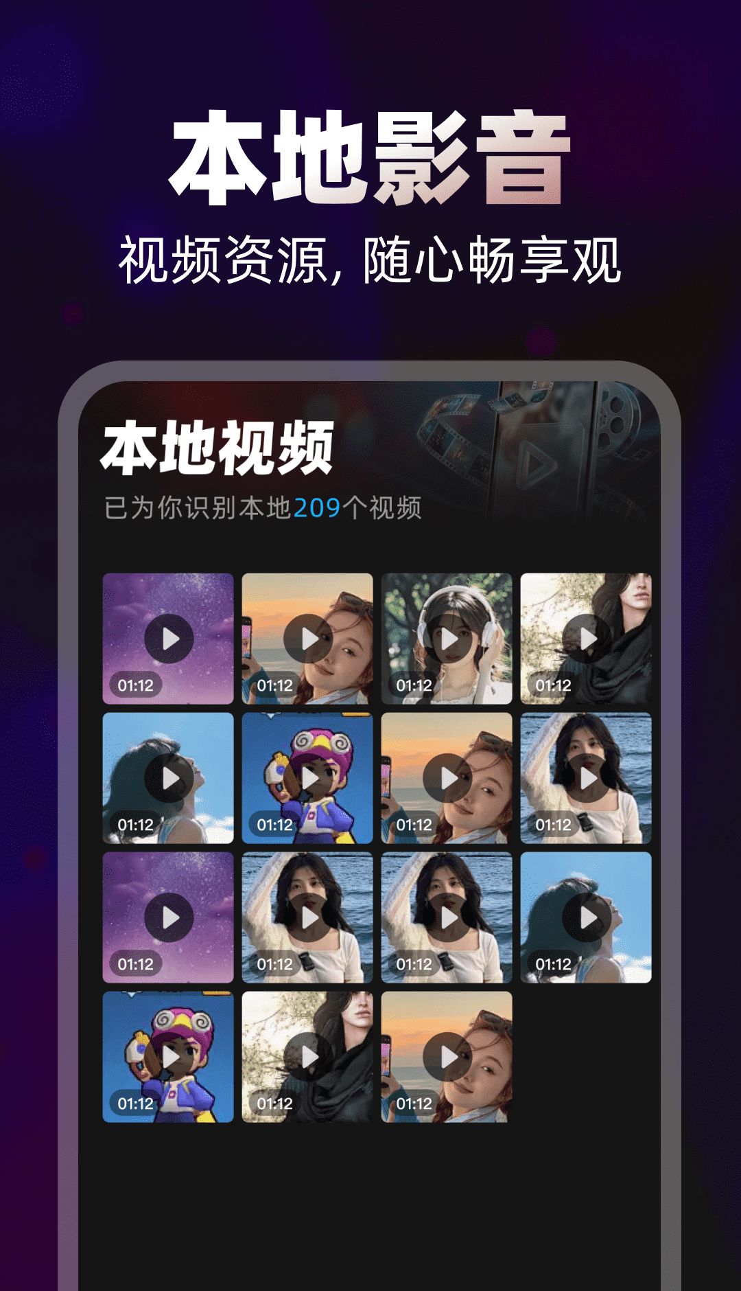 2、本地视频智能识别自动识别手机上的本地视频资源快速组织并显示音视频列表。