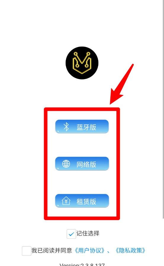 1、打开软件后可选择蓝牙版、网络版或租赁版进行连接操作,根据设备类型切换。