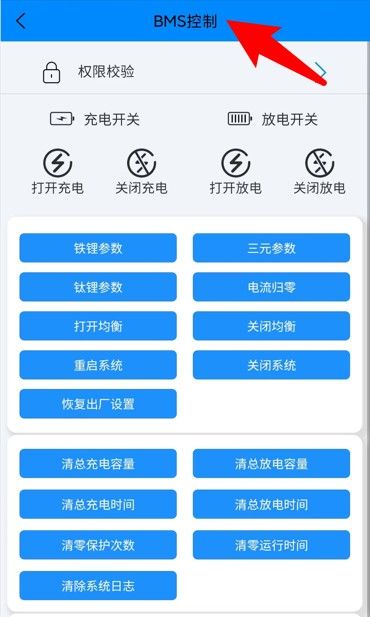 2、在BMS控制页面可进行充放电控制、电量参数设置、均衡系统及日志清除等操作。