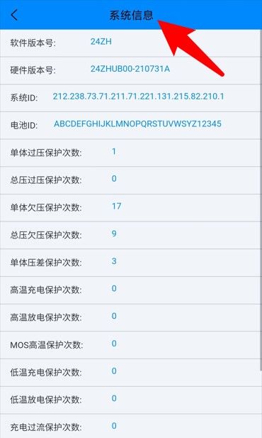 4、系统信息页面展示软件版本、电池ID与各类保护触发记录,便于故障追踪排查。