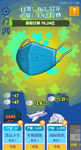 全民造口罩是一款让模拟经营类游戏,在这个世界中,玩家将要体验到不同的乐趣玩法,更多好玩的模式都能随着体验的升级而掌控的,选择不同类型的挑战,你能够获得最大的成就,还有经典的模式能够选择,想象世界中如果没有了口罩,你将如何去生活,所以说现在必须要快速的产生出大量的口罩,这样才能胜利到位,刺激的气氛,让你受益也会更好,加紧时间,完成挑战吧。