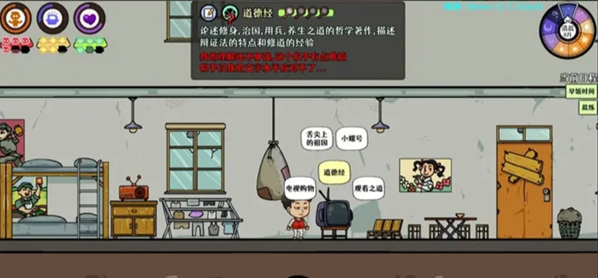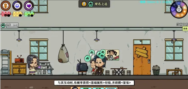 游戏场景中有各种各样的物品可以交互,用于提升属性。每提升一次属性,都会减少相应的体力,心力,脑力值。同时,右上角的时间会流逝一小格。一天有8次训练属性的机会,深夜不能训练属性,只能睡觉。