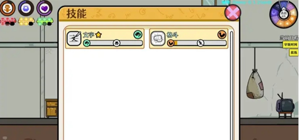 目前开放的技能有:文字,数学,格斗等等。你的基础属性值(就是技能右上角显示的属性值,以上图为例,文字为理解,格斗为力量)和协调属性值(以文字为例,协调属性值为共情)越高,你的技能学习速度就越快。所以各位在学习技能之前,需尽可能拉高基础属性和协调属性。
