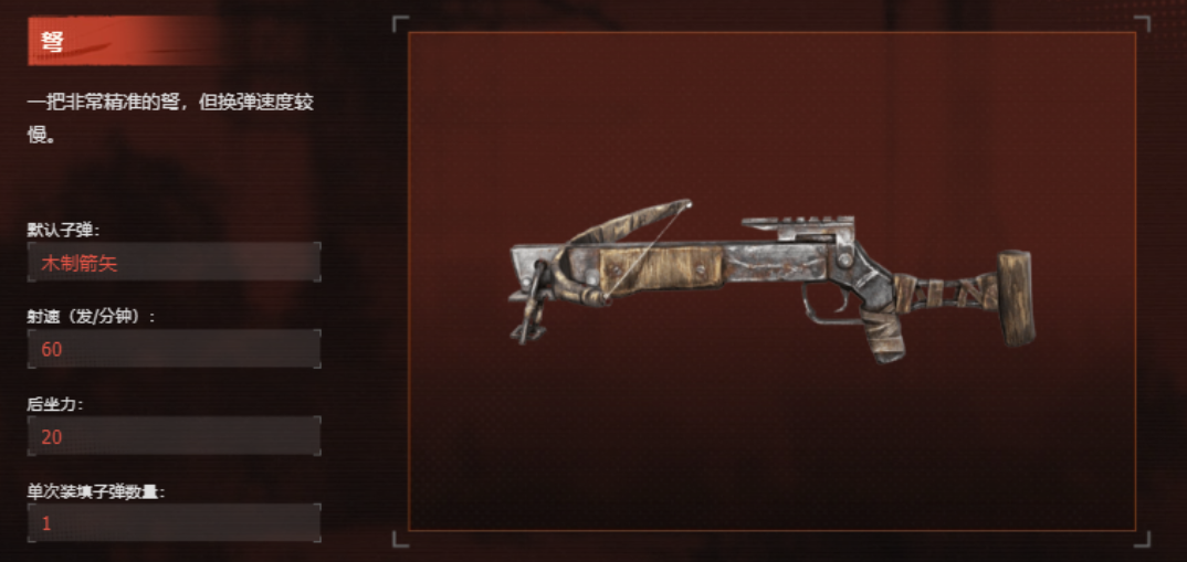 要说最基础的远程武器,那必然就是弩箭了,弩箭本身的获取方式足够简单,并且他的射击精准度极其的高,在夜间希望对敌方进行偷袭的时候,弩箭可以完美做到一击必杀,毫无声息地将敌方的哨兵解决掉,还不会对周围的其他敌人造成惊扰,特别适合在暗中行动做暗杀这一类的活动,在对局中,弩箭也是大多数玩家们所选择使用的刺杀武器,不过这个武器的缺点很明显,换弹速度很慢。