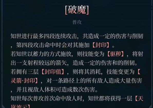 在技能上面,知世使用的武器叫做天岚流云箭,这是一把玉虚院家族里面的人才能使用的武器,在输出的时候一般都会带上庇佑的效果,在一下中使用技能的时候,知世可以带来一个叫做破魔的普攻,在进行普攻攻击的时候最多是可以带来4段连续攻击的,而且可以造成一定伤害之后还可以给敌人带来削刃的效果,在第4段攻击里面,她还可以给敌人施加一个封印的能力,如果此时以蓄力的方式进行技能使用,这个技能还会变成驱秽的效果,射出一支射程相比普攻来说更远一些的箭矢造成伤害。