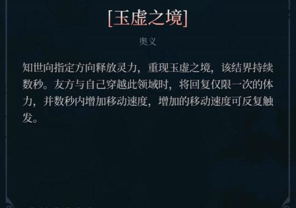 在她的大招上面叫做玉虚之境,使用这个大招的时候是需要灵力的,那么在消耗了灵力之后,就会出现一个境界,这个结界持续时间很长,主要是队友和知世自己进入这个领域里面的话,直接就会触发恢复的效果,并且再一次体力数值恢复,并且在后续几秒之内,她的移速也会得到一定的增强,且这个移动加速是可以反复触发的。