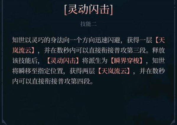 如果是命中的敌人身上带有封印效果的话,此时将击碎他身上的封印,获得一层封印值,如果是释放月灵散射的话,那么这个技能还会加上封印解放的效果,这个效果就是解放之后带来额外5次灵箭输出,在技能2上面,她有一个灵动闪击的能力,就是使用这个技化的时候,会迅速的闪避一下,然后获得一层天岚流云的增益,并且在后期的几秒之内直接衔接下一段普攻,释放了技能之后,灵动闪击将会变成派生的效果,带来瞬间穿梭的效果,然后知世就会得到一个指定位置的瞬移,再额外获取两层的天岚流云增益,在后面几秒之内可以衔接普攻第4段进行输出。