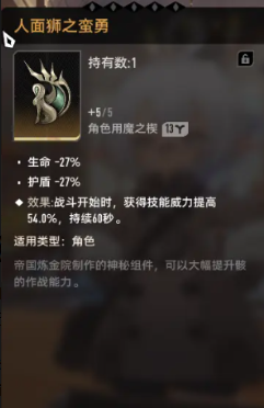 当然别忘记还要搭配人面狮之蛮勇,虽然说只不过是减少27%的生命值,还有护盾,看着好像有一些亏。但是在战斗开始时就可以有效提升54%的技能威力,会有持续60秒的时间。这60秒就是关键的输出期,像那些靠技能打爆发的角色,在开局之后直接一个开大技能,威力就可以迅速的暴涨,可以把敌人打残,甚至可以直接秒杀掉。尤其适合于那些有时间限制的boss战,在开局之后就可以直接爆发出一大波的伤害,可以轻松的奠定胜利。当然具体应该怎么搭配,还是要看所选择的角色。如果玩的是速战速决的角色,那么只需要搭配前面的两个即可。