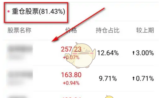 4、下拉可以查看基金的“重仓股票”情况,如下图