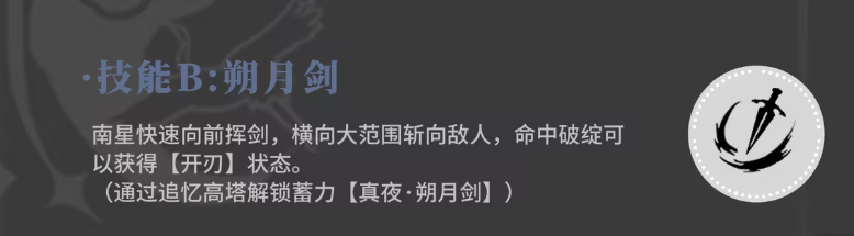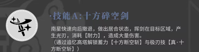 技能一在使用的时候,南星会快速的往后撤退,带来一个聚合的状态,其实这也是专属于她的状态,别人是没有这类效果的,处于聚合状态内的时候,南星有一定的增幅效果,此时只要是她挥剑在一定的区域范围之内,对目标都可以带来光刃输出,当然这个光刃输出是需要消耗很多的耐力数值,带来的伤害也是大量伤害的,此时这个技能叫做十方碎空剑,后期的话大家可以通过追忆高塔的挑战,来解锁这个技能的蓄力效果,也就是十方断空斩的能力,解锁十方断空斩之后能够带来的输出是更大一些的。