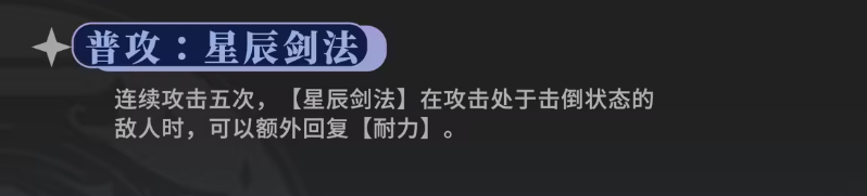 南星的技能上面其实是带有刀剑类效果的,普攻上面也是可以连续攻击5次,普攻的名字也非常好听,叫做星辰剑法,大家使用星辰剑法的时候,只要攻击是处于倒地状态的敌人,那么这里恢复的耐力数值会比较高,在使用魂技星辰变的时候,带来的就是一个强化类型的效果,因为这个强化是根据南星的基础攻击,后面第二段以及第三段的效果进行强化提升的能力,所以造成一定伤害之后,还是可以在怪物倒地状态下进行一定的弱点攻击,带来足够的耐力回升效果。