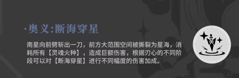 大家也可以使用技能针对敌人的破绽处进行攻击,利用光刃的效果提升自己这个技能上面的输出伤害,南星本身的大招是向前劈,斩出的一刀带来的范围攻击是非常大的,而且是可以对前方造成一个撕裂空间空间的,这个撕裂的空间被叫做星海,同时消耗掉自己所有的灵魂火种,对这个星海周围所有的敌人,带来大范围的高数值伤害,还可以根据刃心的不同阶段来提升此时的能力,在数值上面可以对断海穿星进行强化,强化主要带来的就是伤害类型的提升。