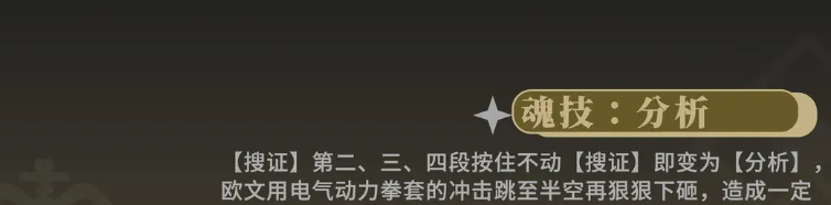 在魂技上面欧文可以带来一个分析的能力,在游戏中只要是使用普攻之后,就可以强化这个魂技的能力,在上面大家使用5次攻击的时候,在第2段、第3段以及第4段里面,只要按住不动技能键,就可以变成分析技能,也就是强化的效果,使用这个强化的效果会根据欧文的全套效果带来足够的加成,欧文会这个时候使用自己的电气动力全套,然后带来冲击能力,这个冲击能力会使他的动作变得更多,此时他会先跳到空中,然后狠狠的向下砸,造成一定的范围伤害,同时会增加很多的怒气数值来给自己做后期的加成准备。