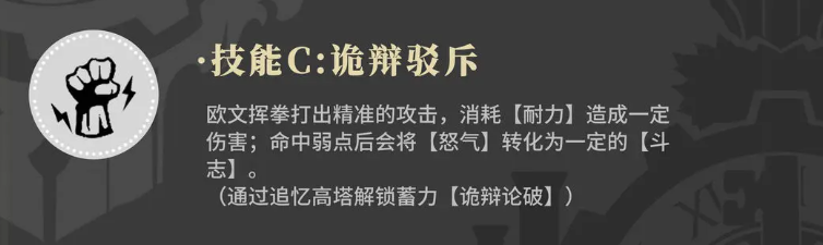 在技能3上面,欧文有一个诡辩驳斥的效果,诡辩驳斥的这个技能使用的时候欧文会挥动自己的手中的拳套,打出一次攻击会消耗一定的耐力数值,造成伤害之后,如果大家生命中弱点的话,那么此时会将怒气转化为一定的斗志,因为他是格斗类型的角色,有这个斗志数值,后期进行拳头输出的话,输出伤害会更大,所以建议大家可以在前期都是数值积累满之后再使用这个技能三。