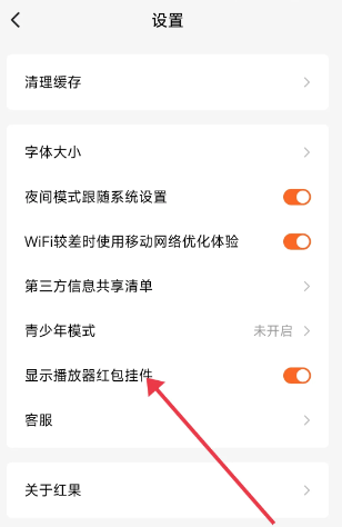 在设置界面内,选择「显示播放器红包」功能,点击开关按钮将其关闭即可。