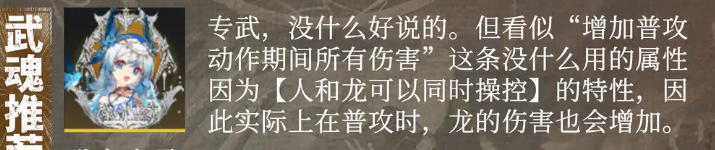 群青之歌:属于一个专武类型的武魂,一般就是固定给伊莱莎使用的,在效果上面是没什么特别的弱点,有着看似增加普攻动作期间所有伤害之类没什么用的属性,但是因为这个武魂还可以带来人和龙可以同时操控的特性,所以搭配上之后在实际的普攻时,龙的伤害也会增加一部分数值,针对伊莱莎的输出提升效果最强。
