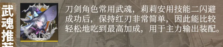 魔女夜宴:是刀剑类的角色常用的一个武魂,特别适配莉莉安,毕竟这是一个冠2角色,所以强度很高的同时搭配这个武魂之后,莉莉安还可以用技能二闪避敌人的输出,只要闪避成功后期保持红刃就非常简单了,这也是这个武魂能够带来的继承,因此搭配这个武魂之后大家就能比较轻松地吃到最高的加成数值,所以这个武魂也是可以用于主力输出来装配的。
