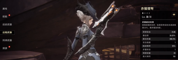 接着还可以来看一下属性,这把武器的贯穿攻击就可以直接达到31.85。如果在游戏中遇到了扎堆的敌人,那就可以轻松的完成穿透输出,完全不需要害怕小怪的围堵。还有30.03%的暴击率以及300.03%的暴击伤害。在叠加完攻击速度之后,暴击频率就会迅速的上涨,伤害也可以迅速的起飞,难怪在游戏中又被大家称之为射击速度的王者。