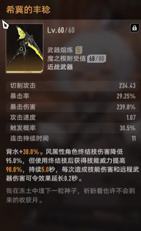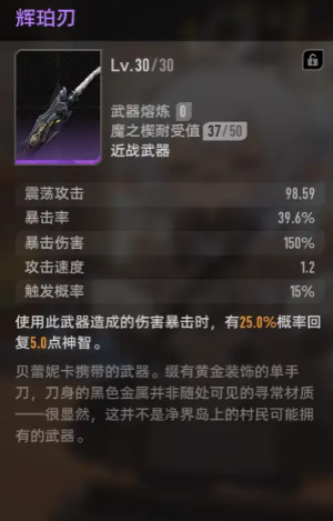 那从实力这一方面来看,也可以对比一下辉珀刃,这一个武器获取真的是一点门槛都没有,新手在走完流程之后就可以获取。后期如果觉得不够用,也可以到卡池里面抽卡获取。对于玩家而言,很适合用来开荒,在暴击的时候就可以有机会提升神智。对于一开始比较缺能量释放技能的新手来说,这就如同是救命稻草,而且这武器一点都不会挑人,不管是哪一个角色都可以用来过渡,真的还是很舒服的。