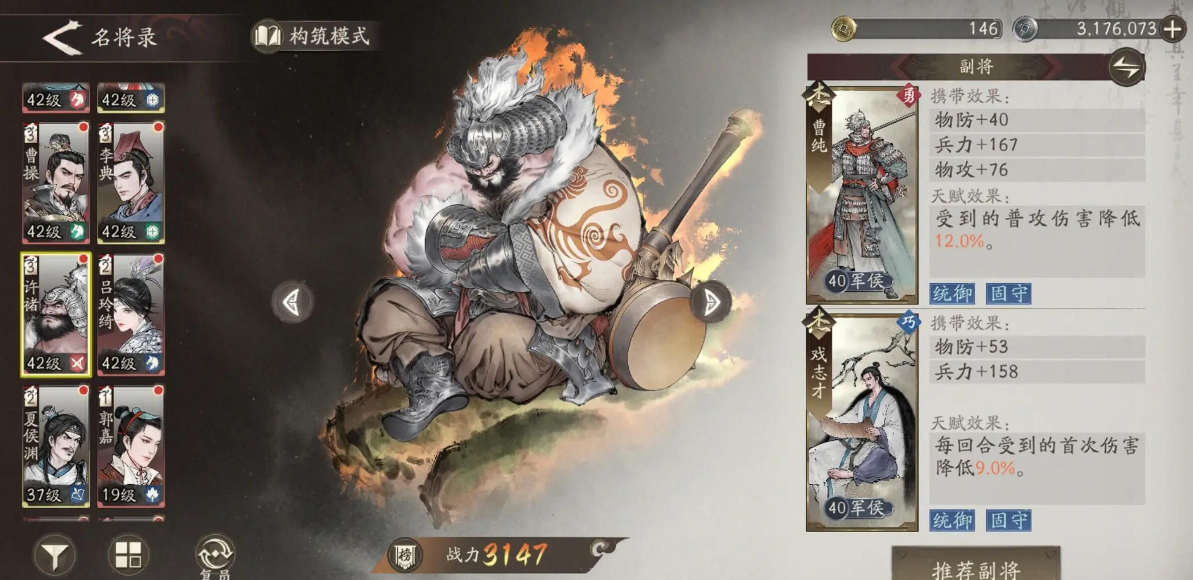 首先说戏志才自身,它兵力低于90%时法攻加9%,行动结束若还不到50%就回血4%,这种动态平衡能力让郭嘉、许褚队伍战斗力直接翻倍。如果说能发挥它的最大价值那一定是要把兵力控在50%-90%之间,这是也是他能提供输出增益最大化的关键。残谋技能第三回合主动卖血到70%最划算。这时候刚好能吃满增伤,又不会太低血被秒。配合郭嘉的减血效果,两个增伤叠起来有24%,输出瞬间爆炸。不过得看对手调整,打爆发队就保持80%血,打续航队大胆压到60%,这操作得多练才熟练。