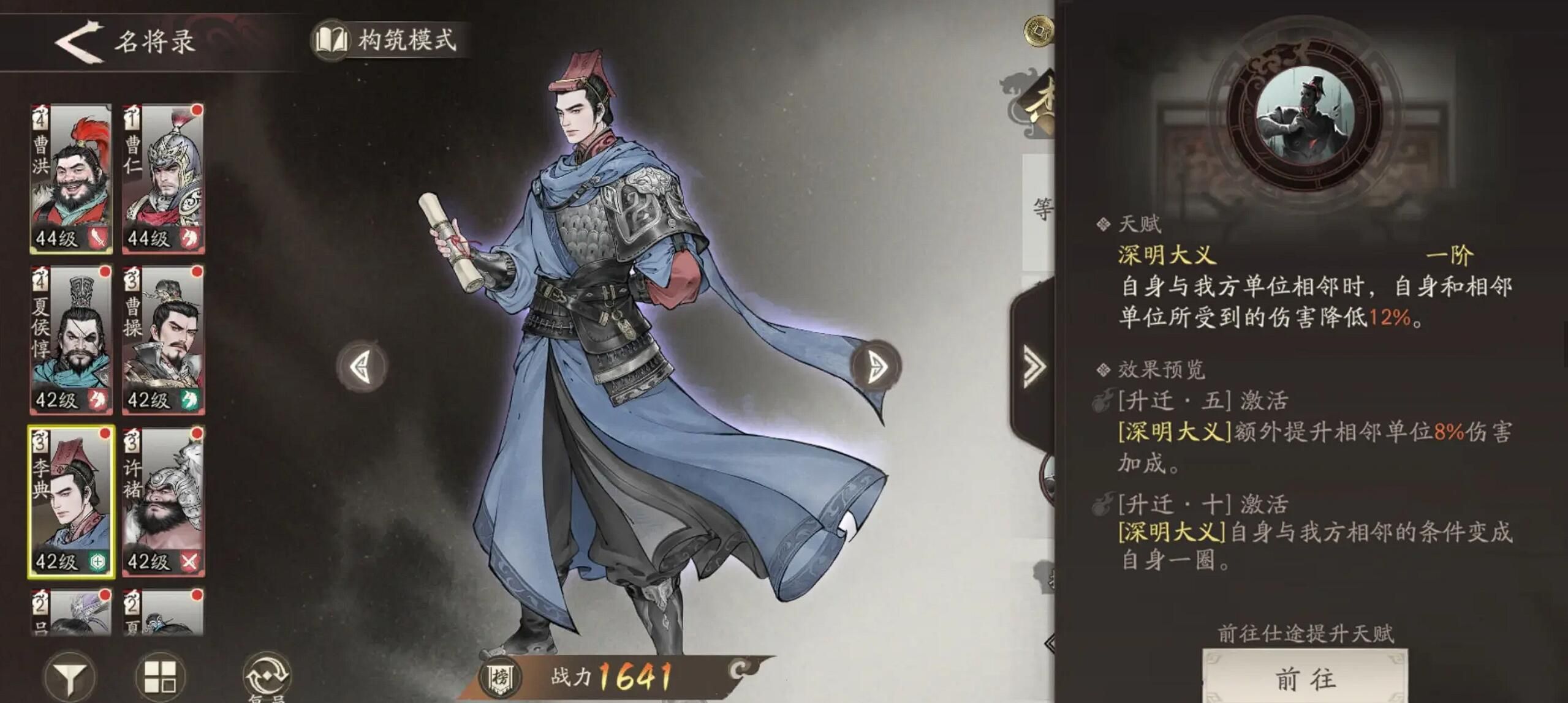 对于同类型的武将对比,开荒期带他比带夏侯惇稳多了,算得上是平民福音了。技能深明大义触发机会真的高,基本每回合都能生效。基础效果是和友军相邻时双方减伤12%,升迁到五阶后还能加8%伤害,十阶直接把相邻范围扩大到一圈。实战里都是让他站曹操和张辽中间,这样两个人都能吃到减伤,打持久战的时候这12%减伤比多带个治疗还管用。不过要注意别让他离输出太远,不然技能就浪费了。