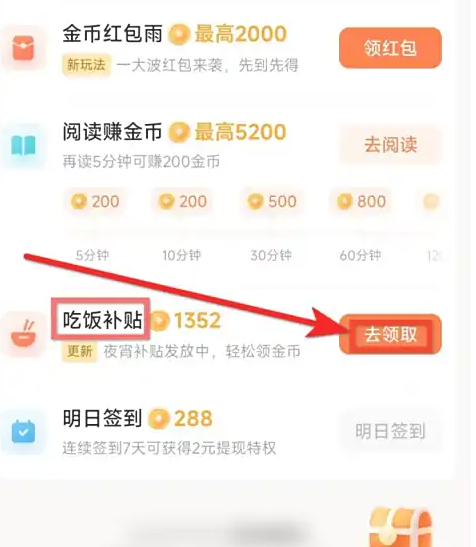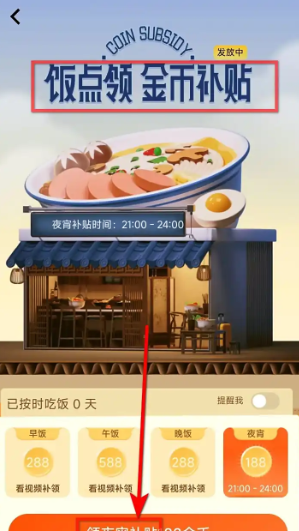 3、进入饭点领金币补贴页面,点击领夜宵补贴。(夜宵时间是21到24点,大家需要在该时间段去领!)