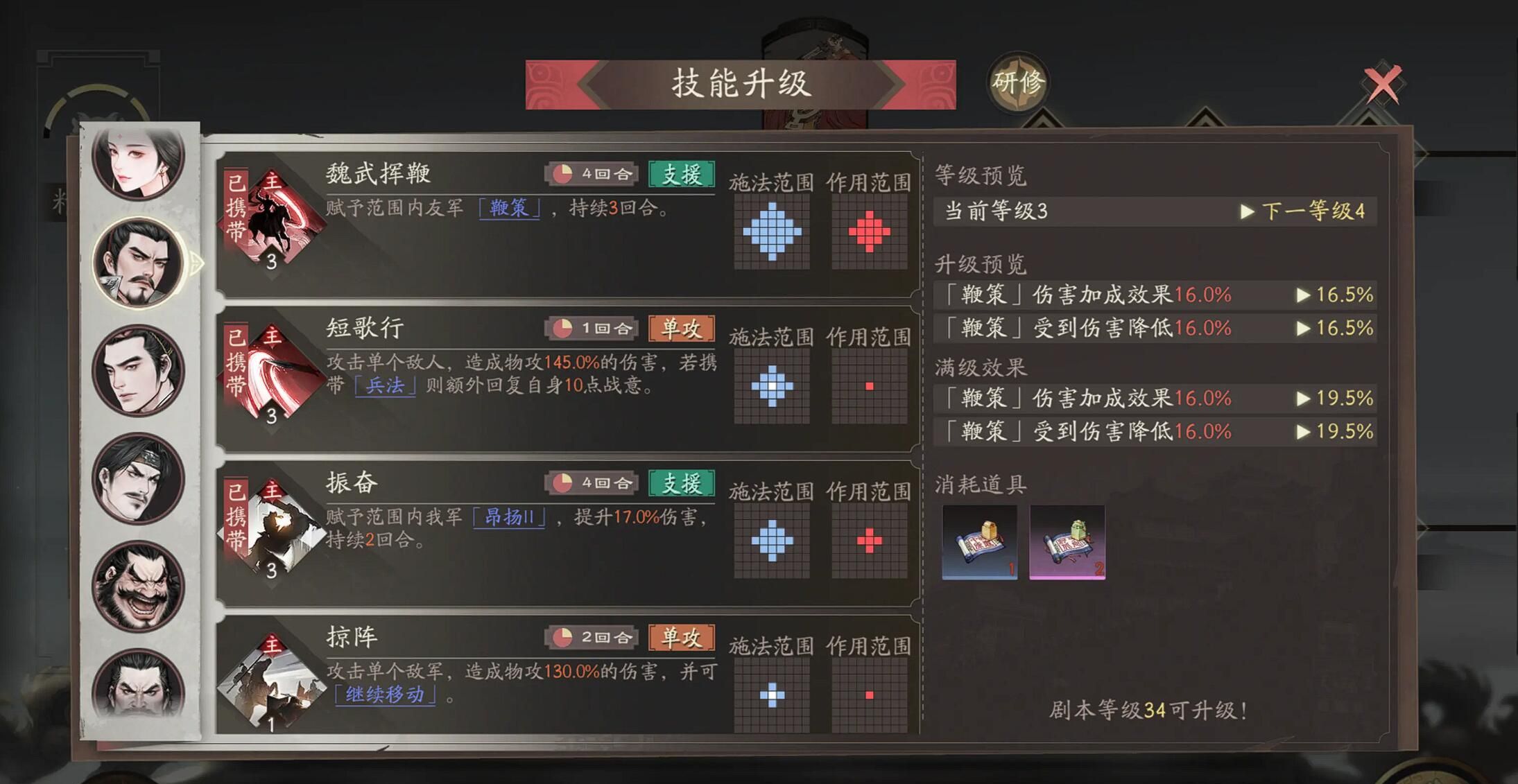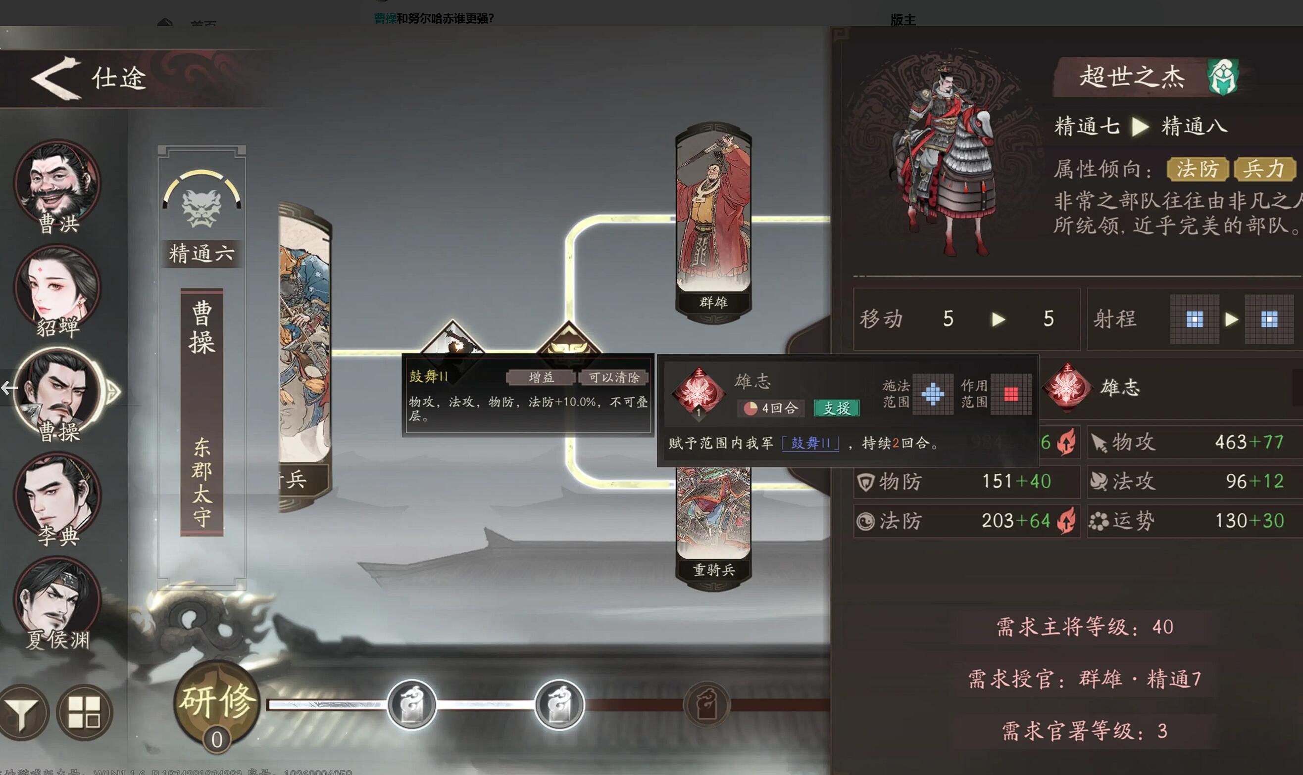 我们搞定阵容之后就要注意一下技能加点了,推荐大家先点群雄线的魏武挥鞭,他能造成范围伤害附加16%增伤和减伤,是开荒期核心buff,然后就点出天下归心(重骑兵线),唯一光环技能提升菱形2格内战法伤害10%。仕途的话可以先把重骑兵线解锁到40级拿天下归心,再补群雄线魏武挥鞭,最后点雄志(超世之杰)弥补天赋兵法持续时间不足,这个技能加全队10%攻防,能和天赋叠加用。