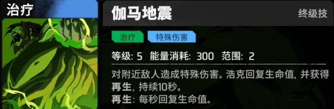 伽玛地震这个技能前期如果使用的话,其实在输出是就上面不算很高,但是他主要的核心是在回血以及再生的效果上面,回血的话,是可以给浩克带来足够的生存能力,而再生能力的话,基本就是一个复活类型的效果了,所以他算作是一个非常全面的角色。