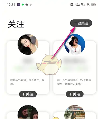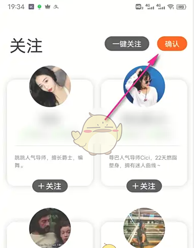 跳跳舞蹈app一键关注教程:打开跳跳舞蹈APP,进入关注界面查看对应的博主列表,找到想关注的博主后点击其账号右侧的“一键关注”按钮,在弹出的黄色确认框中点击“确认”,即可快速完成对该博主的所有内容关注。