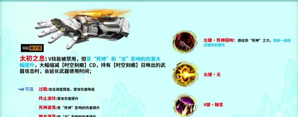 太初之息这个词条可是一个非常好用的词条,太初之息的主词条的会直接把V技能给禁用掉,而且若是想要用右键技能召唤武器的话也是不允许携带技能卡的。