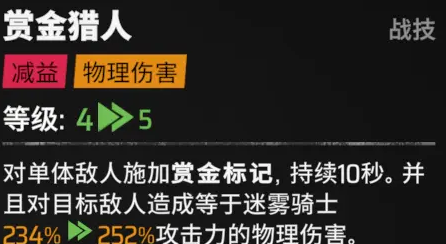 首先来看她的赏金猎人这个伤害技能,可以带来一定的减益效果,并且打出赏金标记,这里是对单体敌人带来的赏金标记,这个标记存在时间会持续10秒,并且同时还可以对目标造成迷雾骑士270%左右的物理伤害,而这个赏金标记的效果就是,有此类敌人被击败的时候,迷雾骑士身上获得1点法力值,这个技能可以恢复点法力。