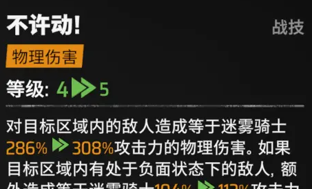第二个技能叫做不许动,主要是用来造成物理伤害的,并且对面有负面状的话,额外造成100%多的伤害,使用这个技能的时候可以对目标区域内的敌人,带来迷雾骑士330%左右攻击数值的物理类型伤害,如果此时这个目标区域之内有敌人身上之前已经有负面状态的话,还会额外带来120%左右攻击的物理伤害,那么同理,这个技能也是一个对方有负面状态的话,伤害增加。