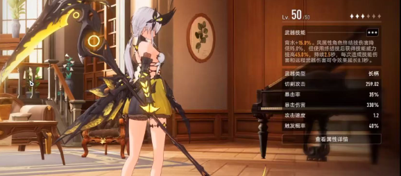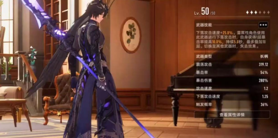 不同产品武器的侧重性会有些区别,有一些就可以增加15%的背水效果。虽然说风属性角色终结技能伤害就会降低95%,但是放完终结技能之后也会提升45%的技能威力。大概会持续2.5秒左右,每次打伤害还会持续0.1秒,爆发期还是比较出色的。还有雷属性适配的武器,下落的攻击速度就可以额外的增加25%。雷属性就可以直接用它下落攻击,然后去叠加暴击率,基本上每一层是10%暴击就可以直接拉满。就是在切换角色时就会掉效果需要注重的操作节奏。