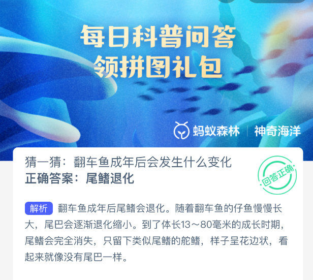 猜一猜:翻车鱼成年后会发生什么变化?【神奇海洋】10月11日新题目已开答!正确答案现已公布,点击领取拼图,一起为修复海洋生态贡献力量!今日正确答案是:【尾鳍退化】,翻车鱼成年后尾鳍会退化。随着翻车鱼的仔鱼慢慢长大,尾巴会逐渐退化缩小。