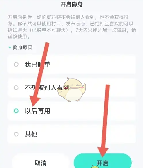 5、弹出下面的界面,然后选择隐身原因,再点击【开启】即可。