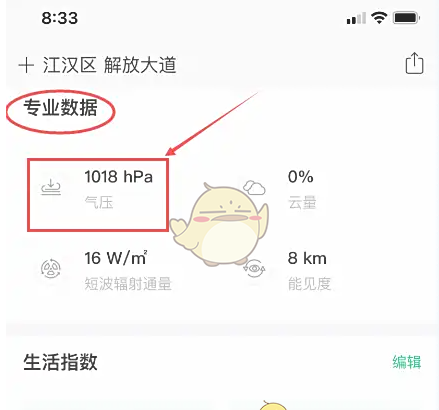 3、找到专业数据,查看当前城市气压。