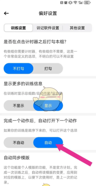 3、找到【完成一个动作后,自动打开下一个动作】区域,点击【自动选项】即可完成设置系统动作训练自动顺序播放模式了。