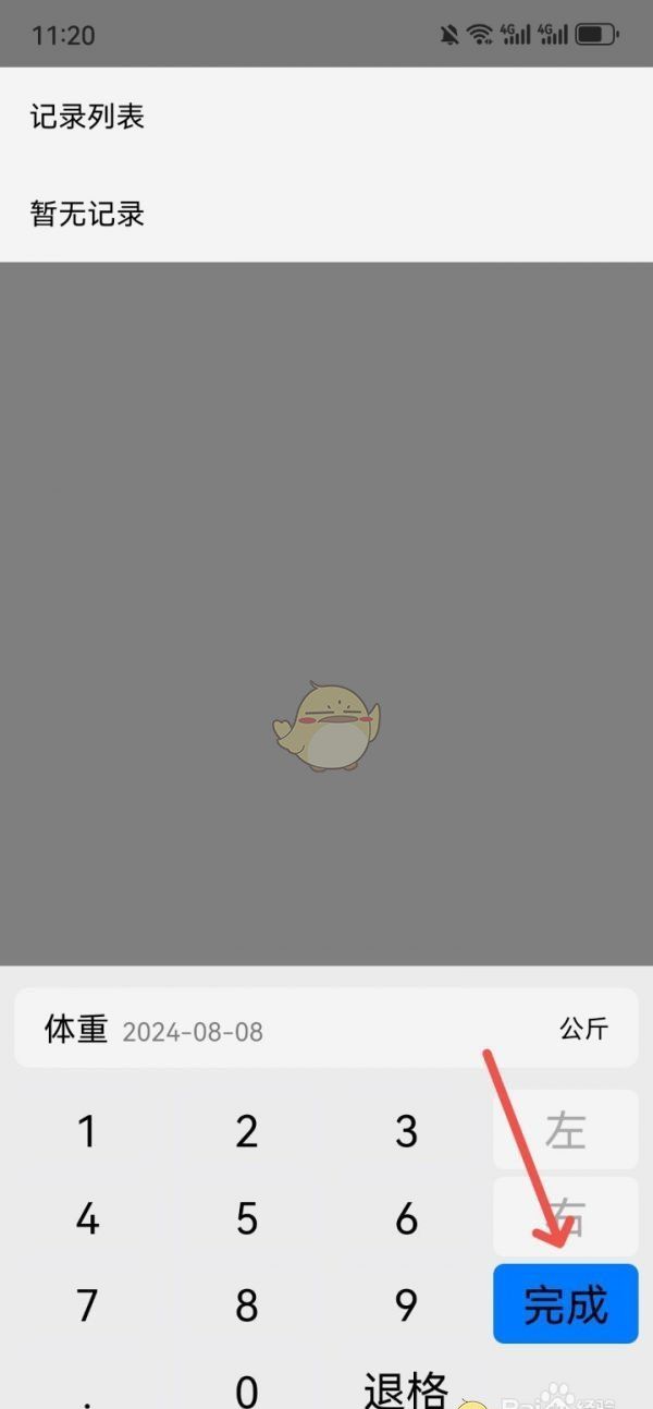 3、进入体重数据记录页面,输入体重数据,点击完成按钮即可