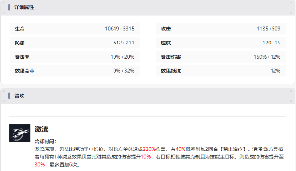 先来看一下属性面板实力真的是一点都不含糊。基础生命值会达到10,649,并且还会额外的增加3315,续航的底子还是很扎实的。攻击力是1135,加上509的加成,输出的能力很不错。防御力是612,并且还会有211的增幅,并不算特别的脆。速度是120,加上15出手的节奏也是比较舒服的。暴击属性也会很亮眼,基础暴击率10%+20%的加成暴击伤害是150%加上12%。在打控制还有爆发时都会很有保障。